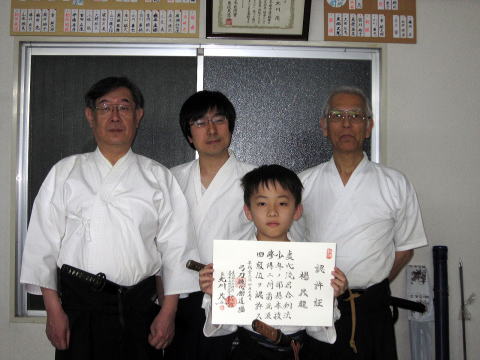 | 浦上則國、山口健太郎、塚谷才英、三剣士の昇段写真 左から、山口剣士、塚谷剣士、北川師範、浦上剣士 平成26年6月27日(金) 於 福井市 城之橋幼稚園 |